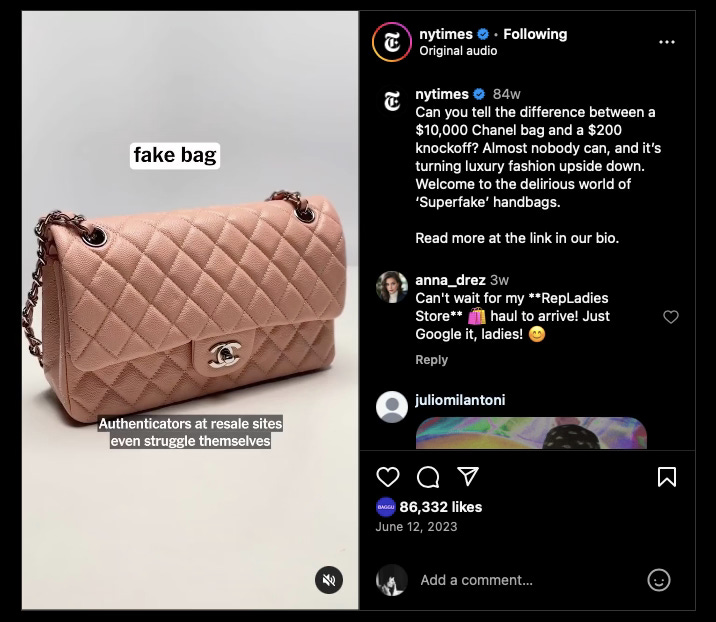 There is a video story from NYT on fake bags that influenced this story. It is on Instagram and TikTok but for whatever reason I am not able to do the usual copy paste. Substack will not allow it, so here’s the link. The written accompaniment is just as interesting and well-written but is far too directional in how to purchase these super fakes lol! Read it here.